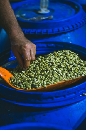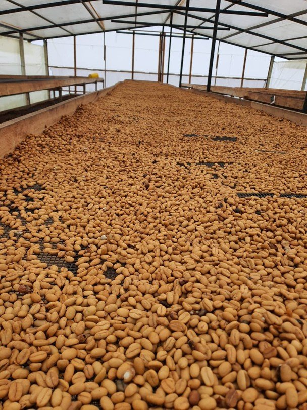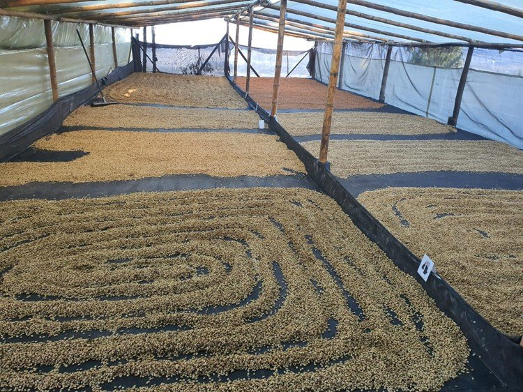 • Po fermentaci se káva omyje čistou vodou a suší na parabolických postelích 25–30 dní za pravidelného obracení.